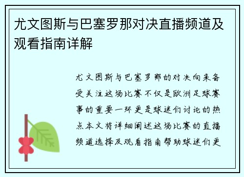 尤文图斯与巴塞罗那对决直播频道及观看指南详解